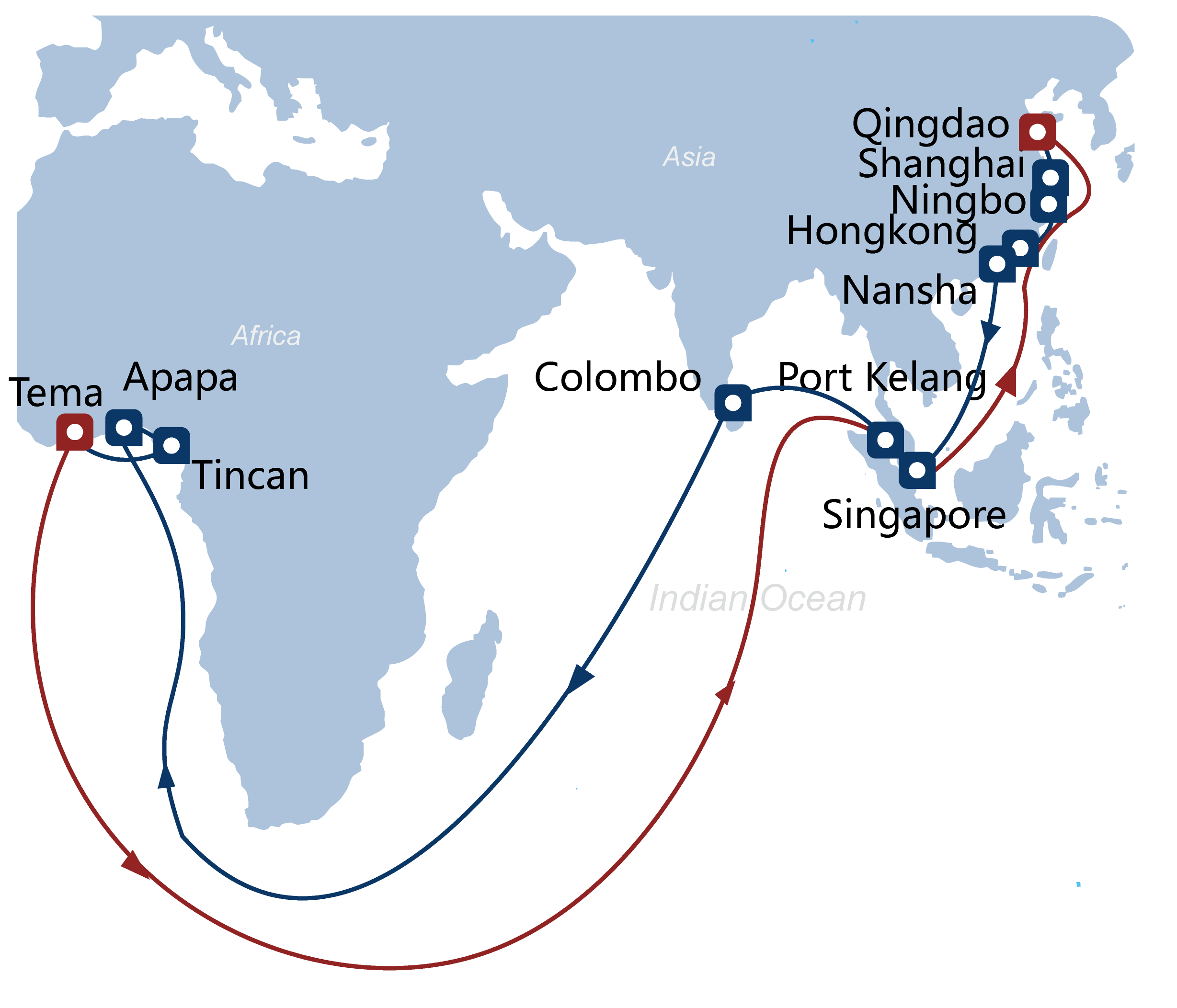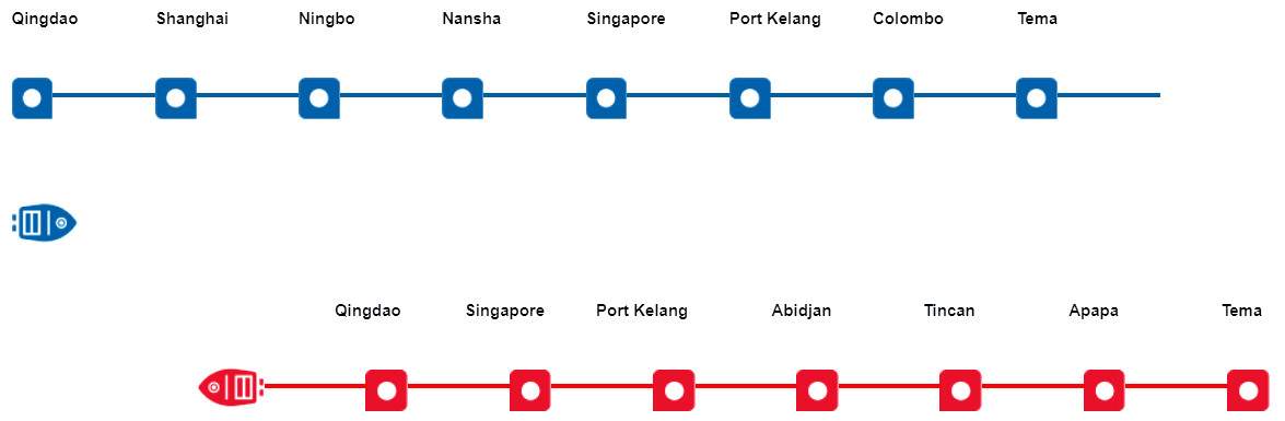 特馬>>阿帕帕>>廷坎>>阿比讓>>巴生港>> 新加坡>>青島