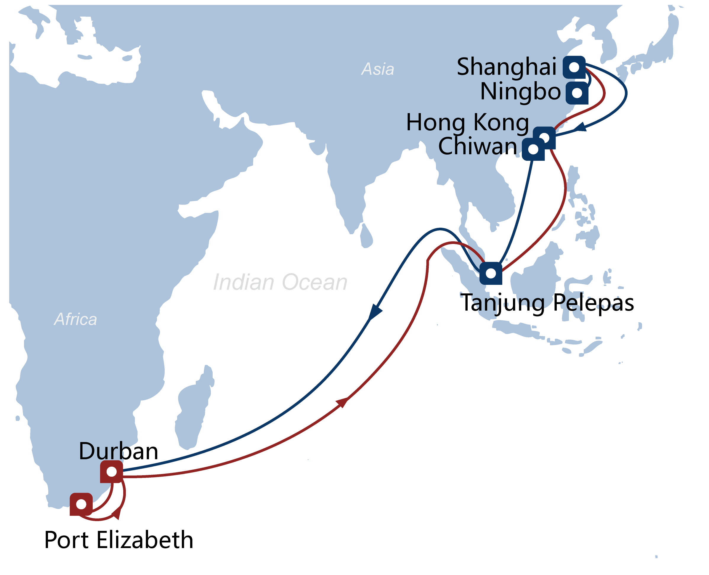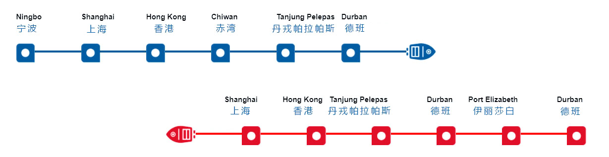 寧波>>上海>>香港>>赤灣>>丹戎帕拉帕斯>>德班